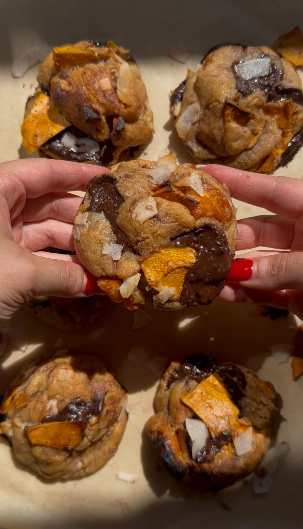 Mango is one of my favourite fruits and I think we can all agree that combined with dark chocolate and coconut it is one of the best combos! These cookies incorporate dried mango to boost the fruity flavour without adding additional moisture. The coconut flakes add a lovely crunchy texture while the batter is chewy and crispy around the edges. A party of flavours and textures in your mouth !